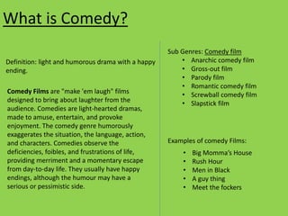 Comedy films aim to provoke laughter and entertainment through lighthearted and humorous stories with happy endings. They exaggerate situations, language, actions, and characters for comic effect. Comedies observe human flaws and frustrations, providing temporary relief from everyday life. Some common subgenres include romantic comedy, parody, and gross-out comedy. In the 1930s, the arrival of sound films led visual slapstick to decline, but verbal and dialogue-driven comedy rose in popularity, exemplified by stars like the Marx Brothers, Laurel and Hardy, and Jack Benny.