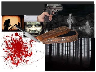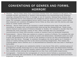 The document discusses conventions of the horror genre in film. It summarizes that camerawork is used to create dramatic effects, with techniques like high and low angle shots, establishing shots of isolated settings, and shaky "footage" camerawork. It also notes that lighting, props, costumes, editing techniques like cross-cutting, and diegetic sounds are employed to add tension and scare the audience. The target audience is typically younger viewers who enjoy being frightened, though some older audiences prefer certain subgenres. To appeal to this target, a film should keep the audience on edge with unpredictable jumps and a relatable teenage cast.