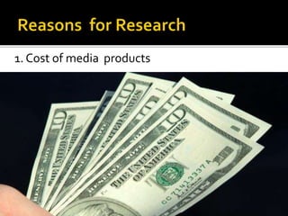 This document discusses research activities involved in planning and producing media products. It explains that market research and product research are important to understand audience needs and ensure commercial viability. Market research includes collecting statistical data on the audience, their awareness of and attitudes towards products. Product research involves developing content, assessing commercial potential, and planning production and post-production processes. Media companies often hire outside research agencies to conduct specialized research as it is more cost-effective than maintaining an in-house team. Careful research and planning of production costs and potential sources of income are necessary to determine a media product's viability.
