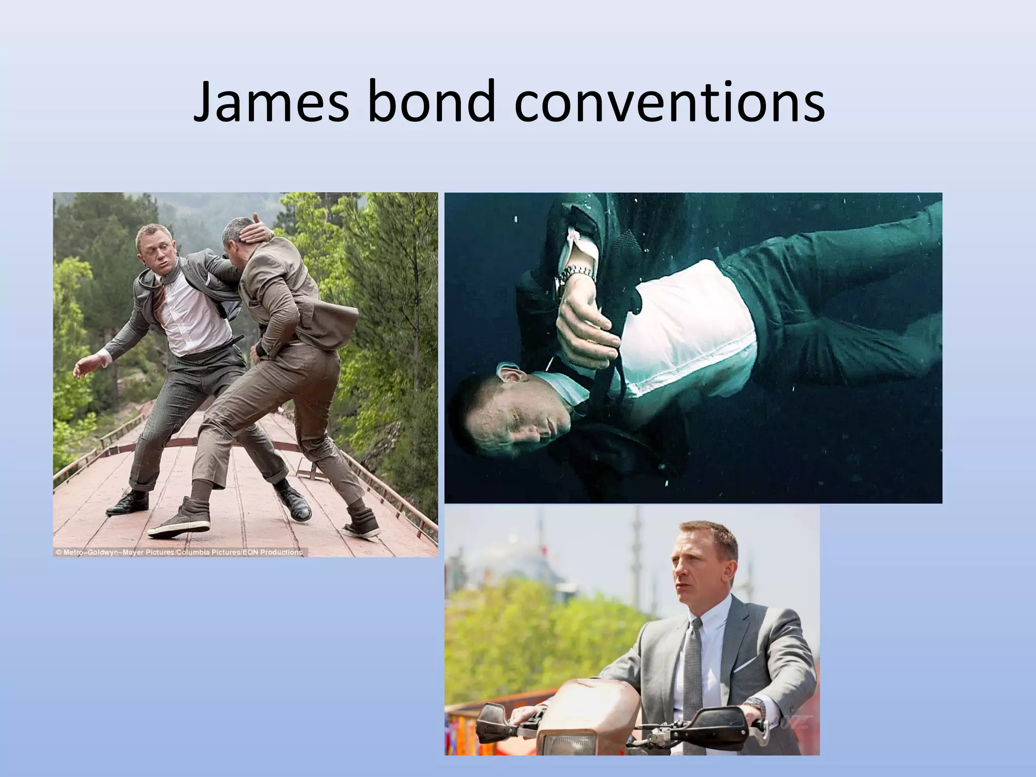 The document discusses conventions used in the opening scene of James Bond films. It analyzes the use of shots, music, pacing and camera work to build tension and engage audiences. A low angle shot creates uncertainty about Bond's fate and the music builds drama during a chase scene. Shots of Bond traveling and in danger relax audiences by showing he will survive while still feeling the thrill. Cross-cutting suggests the speed and mental focus of the chase from Bond's perspective.