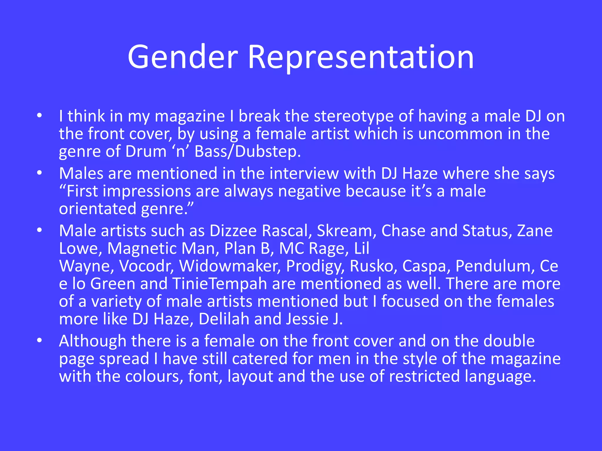 The document summarizes how different social groups are represented in the author's media product, a magazine focused on drum 'n' bass and dubstep music. It represents females by having a female DJ on the cover and focusing interviews on female artists. It also represents males through mentioning many male artists. Younger generations are the target audience so they are represented through clothing styles and language, while older generations are not discussed. Race is represented through mentioning artists of different ethnicities. Nationality is represented by noting artists are from the UK, US, and other countries.