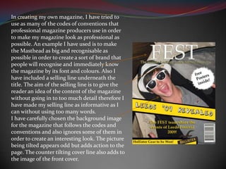 Matt created a magazine to emulate professional conventions. He made the masthead big and recognizable to create a brand. The selling line under the title informs readers of the content without being too detailed. The tilted cover image and counter tilted cover line add interest. The magazine targets a young working class audience through music, clothing and brand reviews they can relate to. It aims to attract fans of the featured Leeds festival through a review and competition.