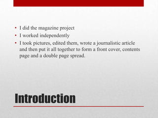The document summarizes a student's media studies foundation portfolio project where they created a magazine covering new music genres like country, folk, rock, and indie. For the project, the student took photos, wrote an article, and designed the magazine layout. They received positive feedback praising the high quality photos and journalistic writing. The summaries highlighted the magazine's focus on indie and rock music as well as aspects that made the pages look professional like the photos and barcode.