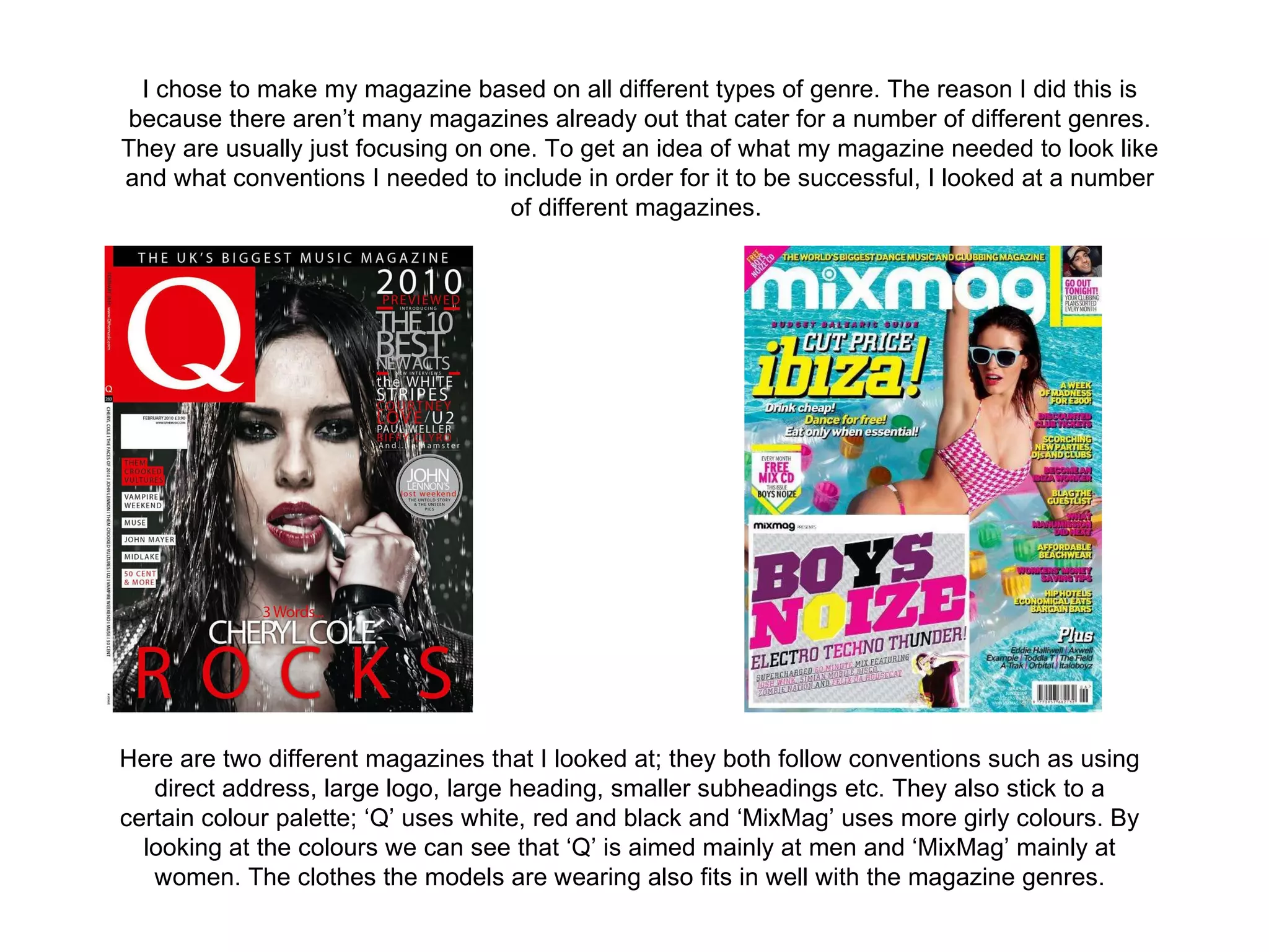 The document describes a student's process in creating a magazine as part of a media studies assignment. The student chose to make a magazine covering multiple music genres. They looked at existing magazines to understand conventions like logos, headings, and color schemes. The student aimed their magazine at both males and females ages 12-19. They included various artists to appeal to different tastes. The student learned about technologies like Photoshop and InDesign in designing the magazine. They felt their final product looked more professional than their preliminary task.