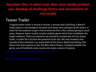 The student used typical conventions for a horror genre teaser trailer, including brief glimpses of actors, blood, and an ominous setting. Feedback was gathered from peers via a survey. The trailer and ancillary tasks were designed to have consistent branding elements like the use of a main character, colors, font, and taglines related to the film's woods setting and childlike elements. Media technologies like YouTube, blogs, and editing software were used for research, production, and gathering audience feedback evaluations.
