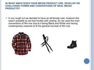 1. The document discusses the filmmakers' media product which is a black and white film noir style short film.