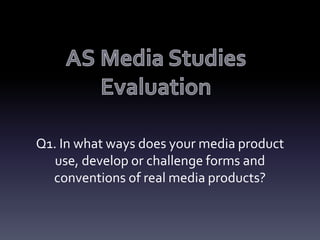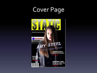 The document discusses how the student's media product both follows and challenges conventions of real music magazines. It summarizes how each section of the mock magazine - the cover, contents page, and sample article - either adheres to or innovates typical magazine formatting and design. Specifically, the cover challenges conventions by obscuring one of the artist's eyes with hair. The contents page features an image of an artist not looking at the camera. And the article includes two images on one page rather than just text. Overall conventions are followed for readability but some aspects aim to match the rebellious nature of the rock genre target audience.