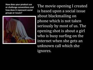 The document summarizes Sadia Fatani's media studies foundation portfolio project on creating a movie opening exploring the social issue of blackmailing on phones. The opening scene shows a girl receiving scary messages on her phone but choosing to ignore them and go to sleep instead of telling anyone. This represents how teenagers today don't take things seriously. The movie challenges conventions by having no background music for the murder scene and the murderer wearing white instead of black. Sadia discusses plans to partner with Universal Studios for distribution due to their wide reach and interest in different genres. Through this project, Sadia improved production skills like camera angles and video editing and learned to use technologies like blogging, tripods, and movie making software.