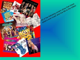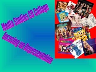 The document summarizes and analyzes the representation of different artists across four CD covers. The Pussycat Dolls CD portrays them as sexy and raunchy to sell albums to teenage girls and boys. Ashley Tisdale's cover is simple with just her name and the album title, portraying her as an independent woman. The Cheetah Girls CD shows them as a fun-loving family group aimed at young girls, focusing on a fusion of hip hop and Indian music. The fourth CD has a colorful collage of beach umbrellas without photos of the artists, likely aimed at club-goers ages 18-35.