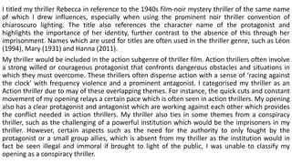 The document discusses conventions used in the opening of the author's thriller media product. It begins in a bleak wooded area to set a mysterious tone, referencing other films. An abandoned house creates a sense of entrapment for the protagonist through claustrophobic space and dirty surroundings. Chiaroscuro lighting is used to represent the contrast between innocence and criminality. The title "Rebecca" pays homage to the 1940 film and is shown before action to not interrupt it. Simple white titles and a heavy breathing sound bridge create tension. The opening ends on a cliffhanger to encourage audience attention, a convention of thriller genres.