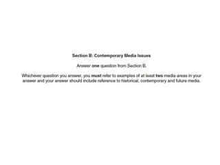 This document provides information and advice for a Level Media Studies exam taking place on Friday June 15th in the morning. It outlines the exam structure which consists of a 2 hour exam with 3 essay questions - two 30 minute questions and a 1 hour collective identity question that students typically perform better answering first. The document also provides health and wellness advice for exam day, suggesting getting adequate sleep the night before, eating a nutritious breakfast, and maintaining a positive mindset during the exam.