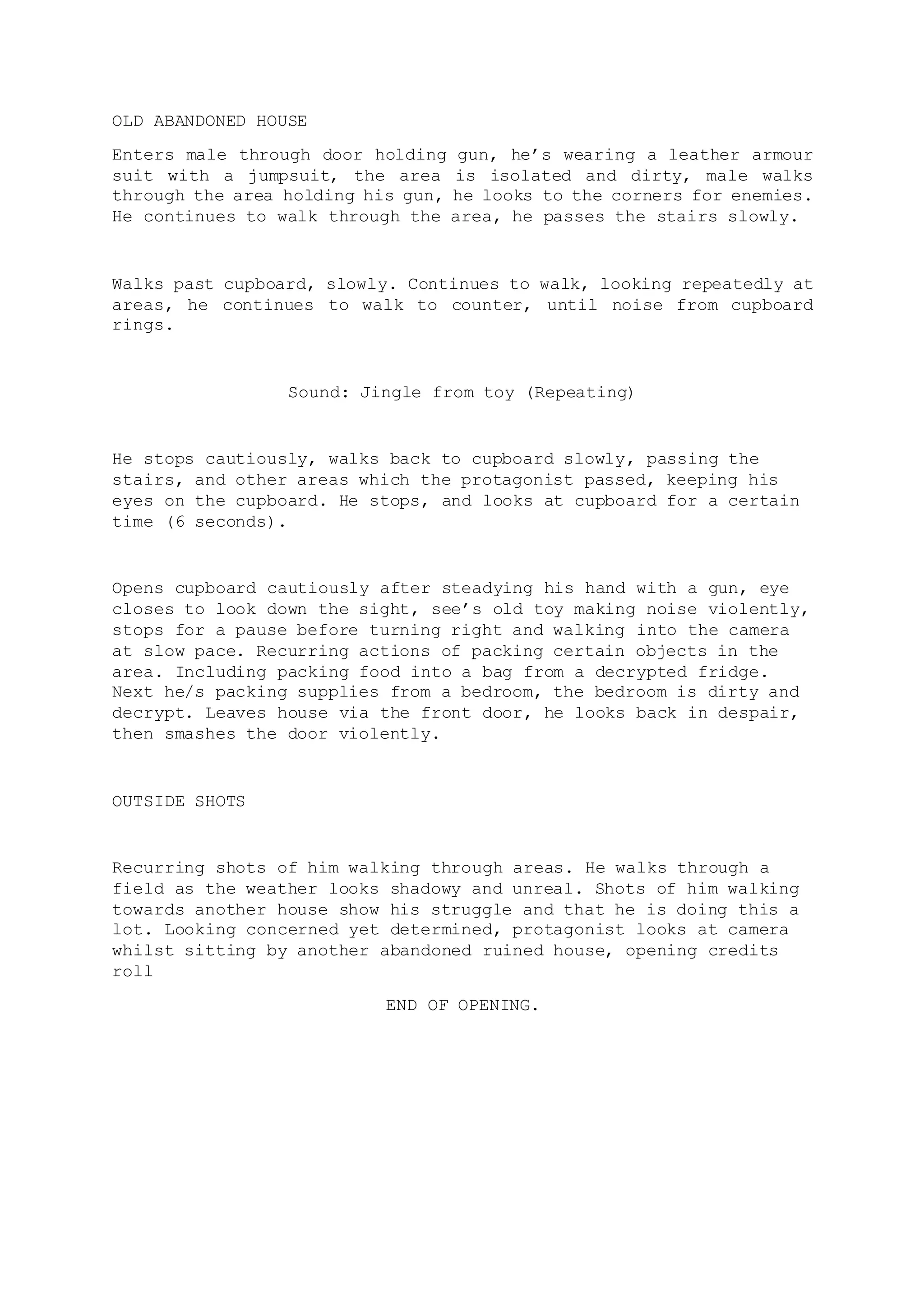 A man enters an abandoned, dirty house armed with a gun. He cautiously searches the rooms, constantly checking for enemies. A noise from a cupboard draws his attention and he slowly approaches with his gun ready. He finds an old toy making noise inside. After packing supplies from the kitchen and bedroom, he leaves in despair, smashing the front door. Further shots show him struggling as he searches other abandoned houses, looking determined yet concerned as the unsettling weather rolls in.