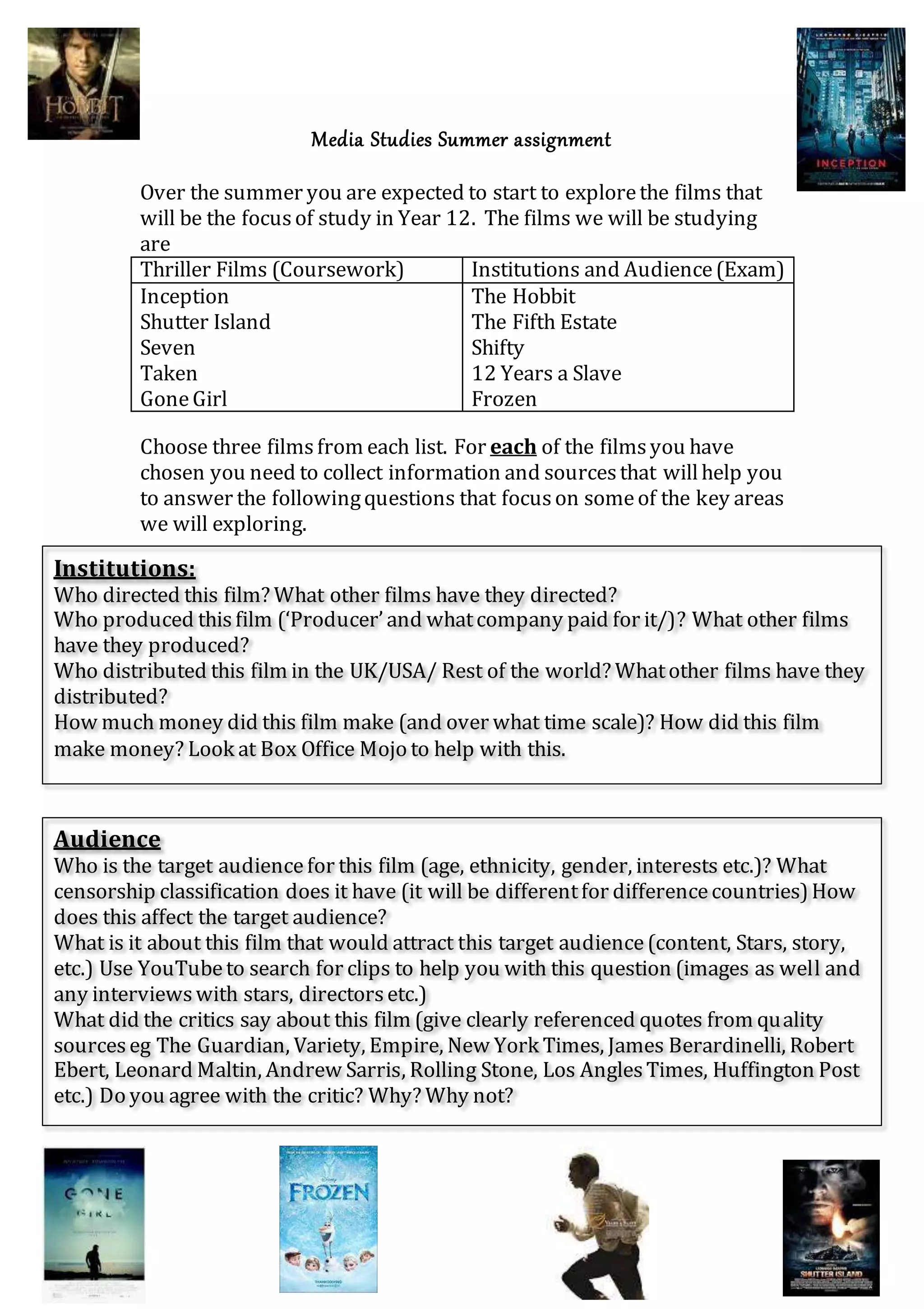 This document provides instructions for a summer media studies assignment. Students are asked to explore 6 films from two lists that will be studied in their Year 12 course. For 3 films from each list, they need to collect information to answer questions about the film's institutions, audience, genre/conventions, and representations. They can present their findings as either a paper-based portfolio or blog-based portfolio, including summaries and sources. The goal is for students to gain understanding of key areas that will be explored in their upcoming course.
