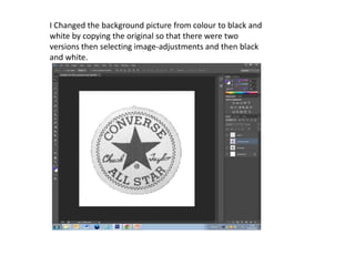 The document provides instructions for editing images and text in Photoshop. It describes how to change an image to black and white while keeping certain colors, how to add text by selecting fonts on dafont.com and pasting into Photoshop, how to transform letters by selecting, skewing, and free transforming them, and how to add brushes downloaded from psbrushes.net by selecting them from the brush panel.