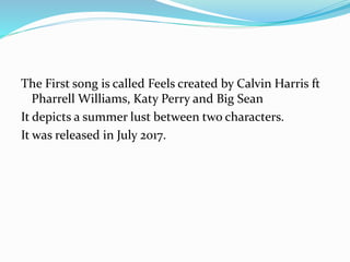The document outlines Goodwin's Rules for analyzing music videos. It states that music videos typically demonstrate genre characteristics through elements like dance routines or stage performances. It also notes there should be a relationship between the lyrics, music, and visuals whether illustrative, amplifying, or contradicting. Additionally, it says record labels want close-ups of artists and artists may develop recurring motifs. It mentions music videos often reference looking and treat the female body in a voyeuristic way and contain intertextual references to other media.