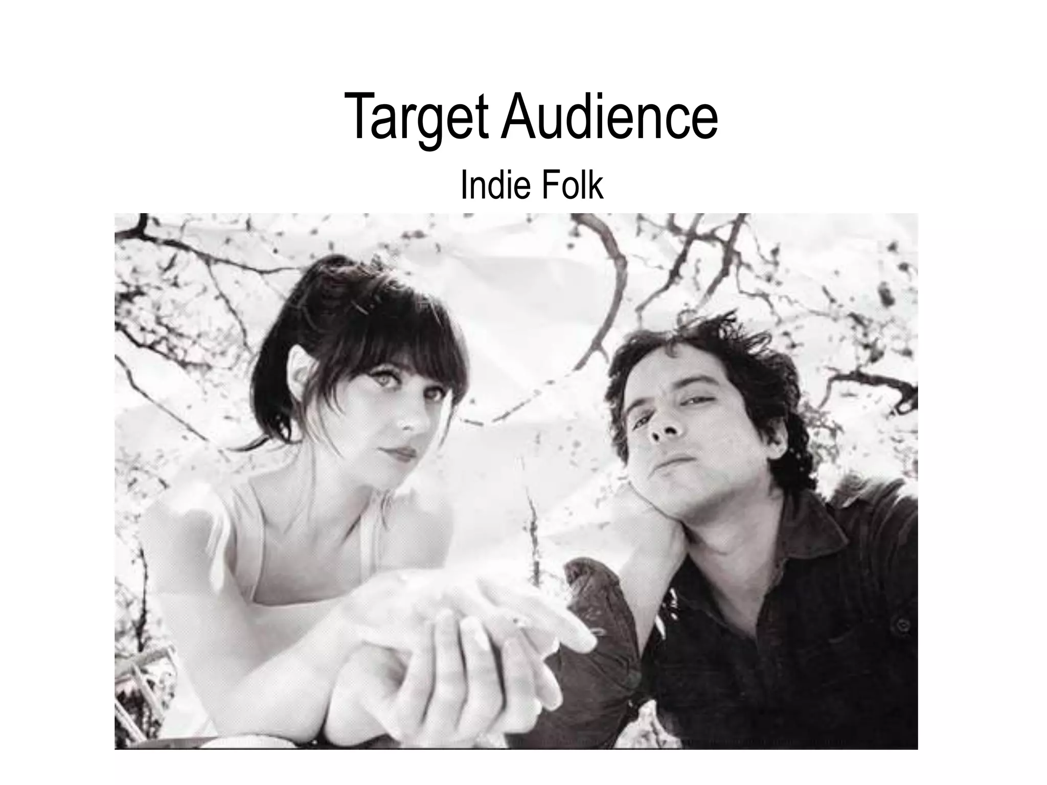 The target audience for indie folk music is mainly young adults aged 16-19 who are still developing their identity. The audience has a mixed gender but may be slightly more female. They are likely on the lower end of the social class scale as many are still in education rather than employment. In terms of psychographics, they are individualists and non-conformists in their attitudes and outlooks, if not necessarily in appearance. They enjoy indie folk artists and bands and consume music through various formats including vinyl, CDs, and streaming platforms. Their interests include magazines, novels, fashion, films that are quirky or different, and local music gigs.