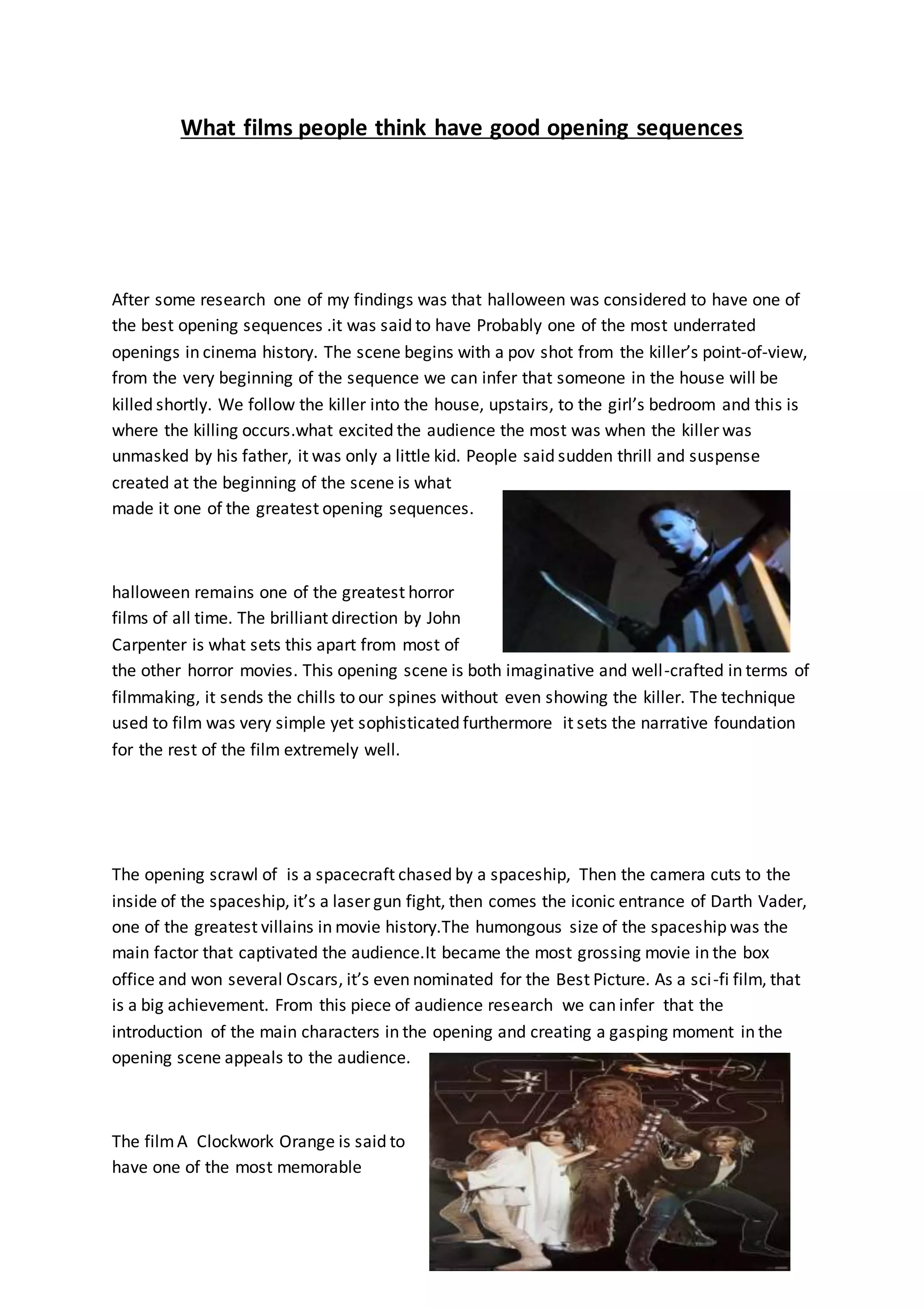 The document discusses and analyzes the opening sequences of several famous films. It notes that the opening scene of Halloween is considered one of the best, as it establishes suspense and thrill from the killer's point of view. Star Wars is also highlighted for its iconic introduction of Darth Vader and sense of wonder from the massive spaceship. Finally, A Clockwork Orange is said to have a memorable opening through its disturbing music, close-up of the main character's evil expression, and scene setting the tone for his criminal actions through innocent models being consumed by evil.