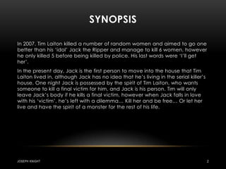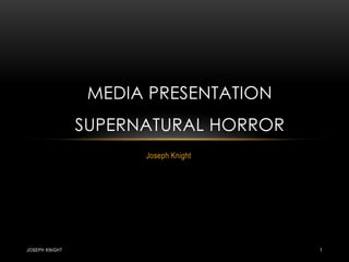 This document provides details for planning a trailer for a supernatural horror film called "Joseph Knight". It summarizes the plot, which involves a serial killer's spirit possessing a man living in the killer's former house and forcing him to kill one last victim. It then outlines the target audience, genre conventions including unseen threats and tensions, potential actors and filming locations, and props that could be used like objects moving supernaturally. The goal is to create an unsettling trailer that draws in fans of similar supernatural horror films.