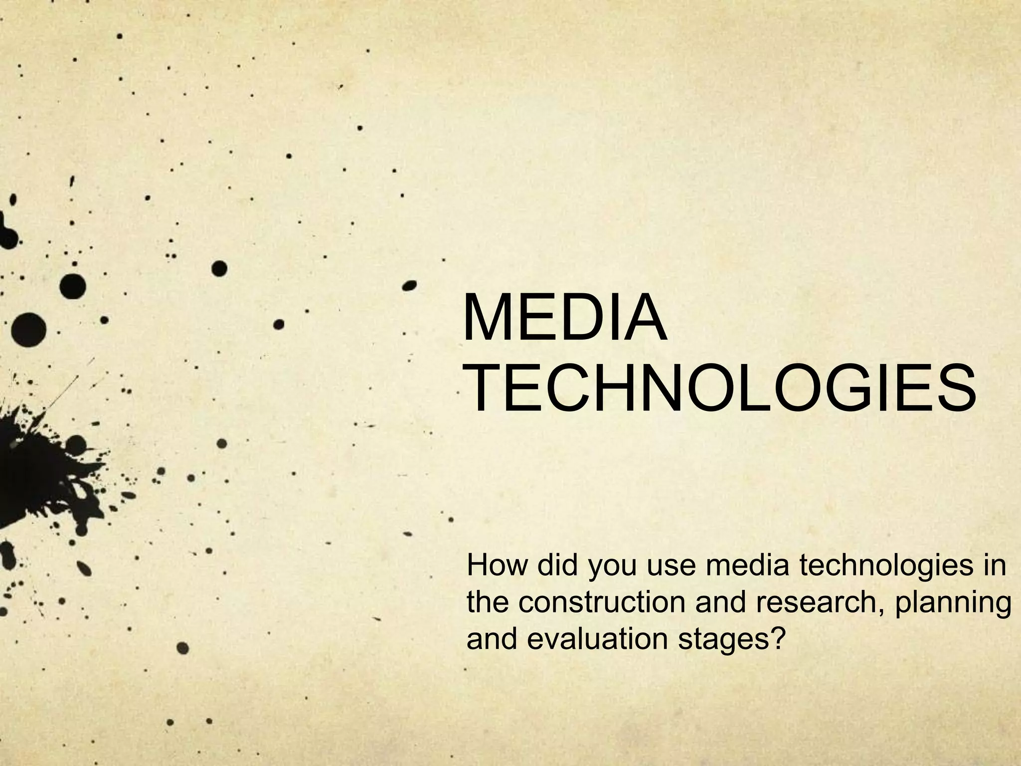 The document discusses various media technologies used at different stages of a media coursework project. Prezi was used as an animated presentation alternative to slideshows. iMovie was used for recording plans and editing video clips, which were then uploaded to Vimeo. Slideshare was used to create animated PowerPoint presentations for blogs. SoundCloud was used to upload and edit audio clips. Final Cut Pro was the primary video editing software used to create transitions, edits, add music/sound, and titles for the finished film. Photoshop was used to create promotional materials for the film. Facebook and Tumblr were utilized to promote and receive feedback on the film. Technology was also incorporated as a theme in the film.