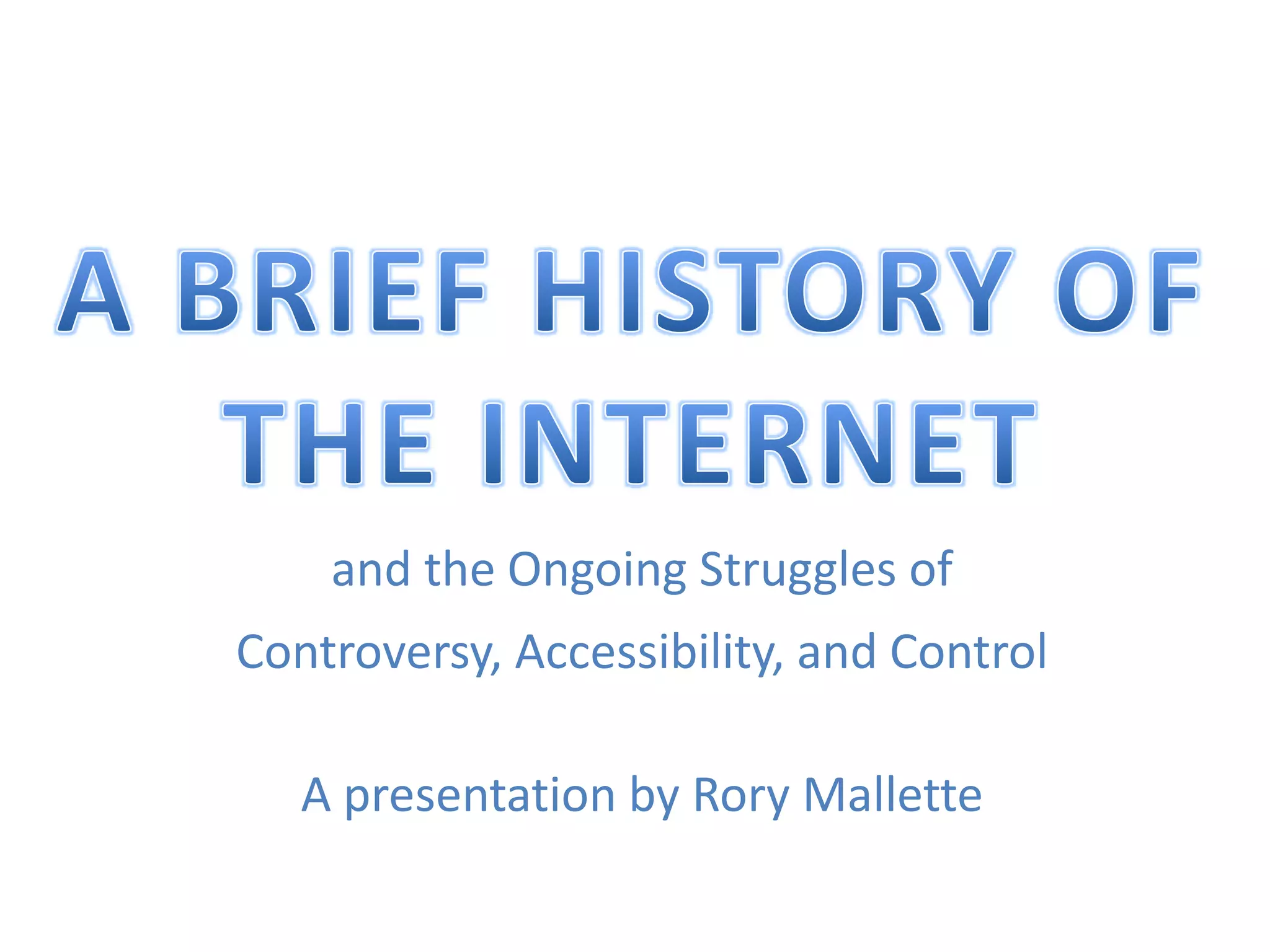 This document provides an overview of the history and development of the internet from its origins as ARPANET in the late 1960s through the present day. It discusses key milestones like the creation of TCP/IP and the world wide web. The document also examines current internet statistics and highlights the global digital divide. Finally, it briefly discusses recent internet controversies and issues of censorship.