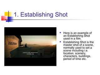 This document defines and provides examples of 17 different types of camera shots and angles used in filmmaking, including establishing shots to set a scene, low and high angle shots, close ups and extreme close ups to show facial details and emotions, long shots and medium shots to show characters' bodies, point of view shots from a character's perspective, panning and tracking shots to follow moving subjects, and hand held shots to capture a character's point of view.