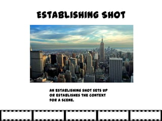 - Establishing shots set the context of a scene. Low angle shots look up and high angle shots look down. Close ups tightly frame subjects while medium close ups show from chest to head.