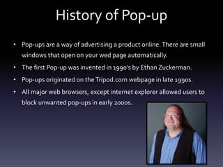 Pop-ups were invented in the 1990s by Ethan Zuckerman and first appeared on Tripod.com pages, allowing automatic small windows to open and advertise products on websites. The first sponsorship video aired in 1946 when commercial TV licenses were granted, and Coronation Street has been sponsored over the years by Cadbury's, Harvey's, and Compare the Market. Existing fashion companies like M&CO and Isme.com sponsor television programs like The National Weather and Loose Women through advertisements.