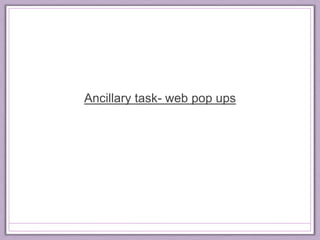 The document provides a history of the internet and web from their origins in the 1960s-1990s. It discusses how ARPANET connected four universities in 1969, the first message sent in 1969, early users like scientists and engineers, the invention of email in 1972, the creation of the World Wide Web by Tim Berners-Lee in 1989, the first website in 1991, the evolution to Web 2.0 with interactive features like social media in 2004, the beginning of online shopping in 1991 with advances like online banking in 1994, the invention of pop-up ads in the late 1990s, and the first television program sponsorship in the US which was 10 seconds for a baseball game for $140.