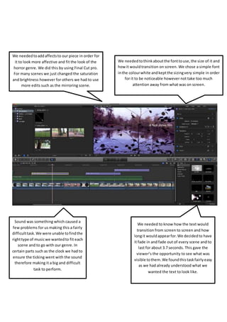 The document discusses the film editing and production techniques used to create a horror genre film. The team used Final Cut Pro to add effects like changing saturation and brightness levels to scenes. They also had to do more complex edits for some scenes, like mirroring. Font style, size, and screen transitions were carefully chosen to make text noticeable but not distracting. Text was made to fade in and fade out over 3.7 seconds to allow viewers time to read it. Sound design proved difficult as finding appropriate music to fit each scene and the genre was challenging. Special care was taken to sync clock ticking sounds with the visuals.