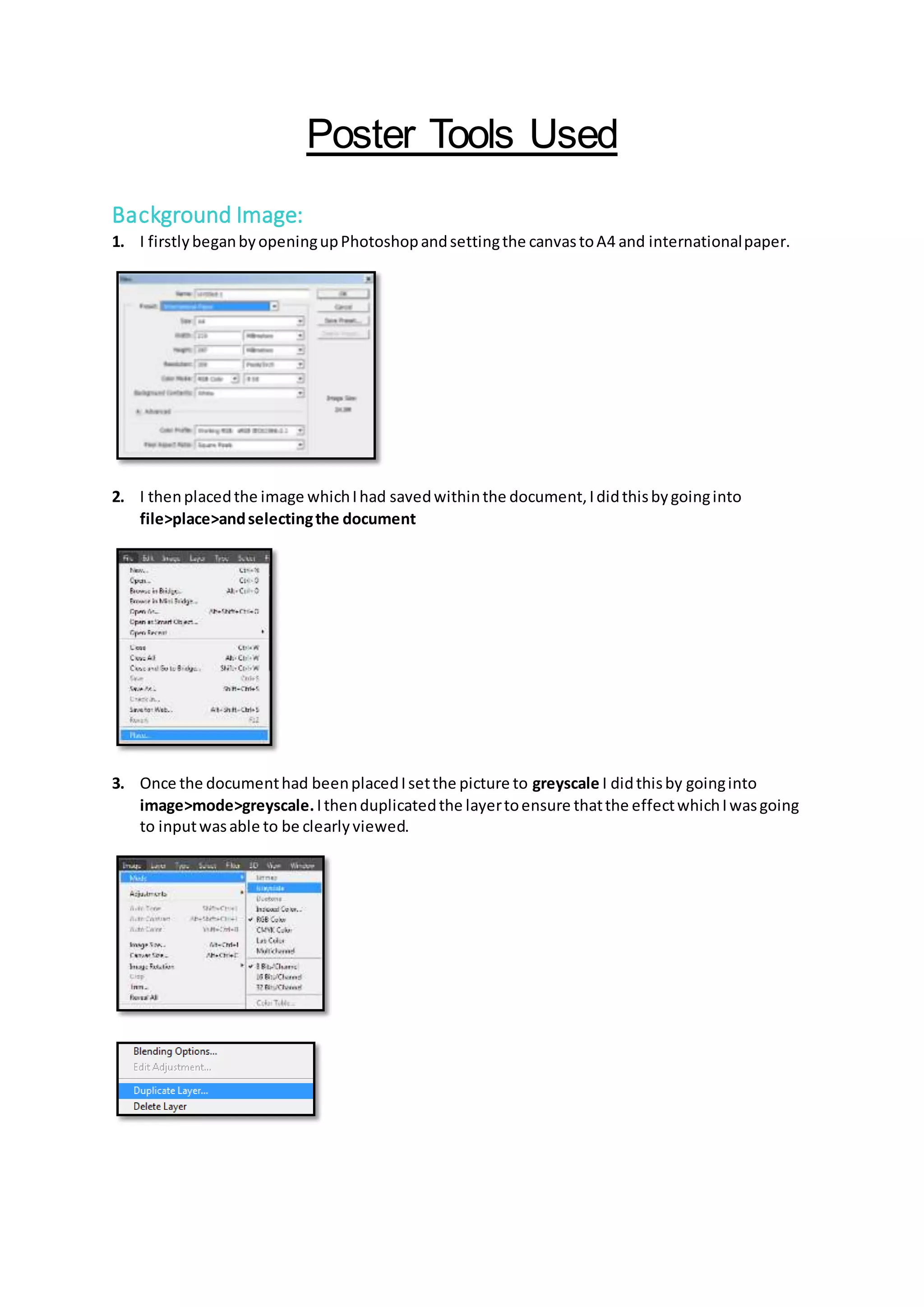 The document describes the steps taken to create a movie poster in Photoshop. It involved placing a background image, converting it to greyscale and adding effects like multiply and gradient to darken it. Text was added for the title, advertisement and credits using different fonts and styles like drop shadows. Sponsor logos were also cropped and color inverted to include at the bottom. The poster was finalized by locking layers and flattening the image.