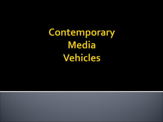 This document discusses different types of media vehicles that companies can use to deliver advertising messages to customers. It describes press/print media like newspapers and magazines that can target broad or niche audiences. It also covers television, noting it began commercially in 1946. Additional media vehicles mentioned are radio, cinema, internet/web advertising, and mobile advertising. Specifics are provided on characteristics and examples of different formats within each vehicle.
