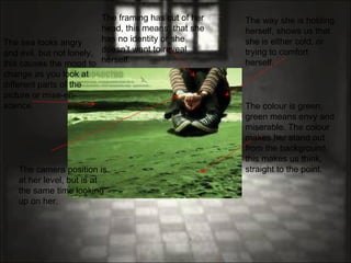 The document analyzes several photographs through descriptions of compositional elements like camera angle, framing, lighting, color, expressions, and positioning of subjects. For one photo, a woman hugging herself is shown in green against a backdrop, isolated through framing and color which conveys envy and isolation. Another photo shows a shadowed man looking down, appearing lonelier through his blackened appearance and lack of connection. A third photo depicts a girl looking away and slumped on a bench with a single vulnerable flower, reinforcing her sad and lonely emotions.