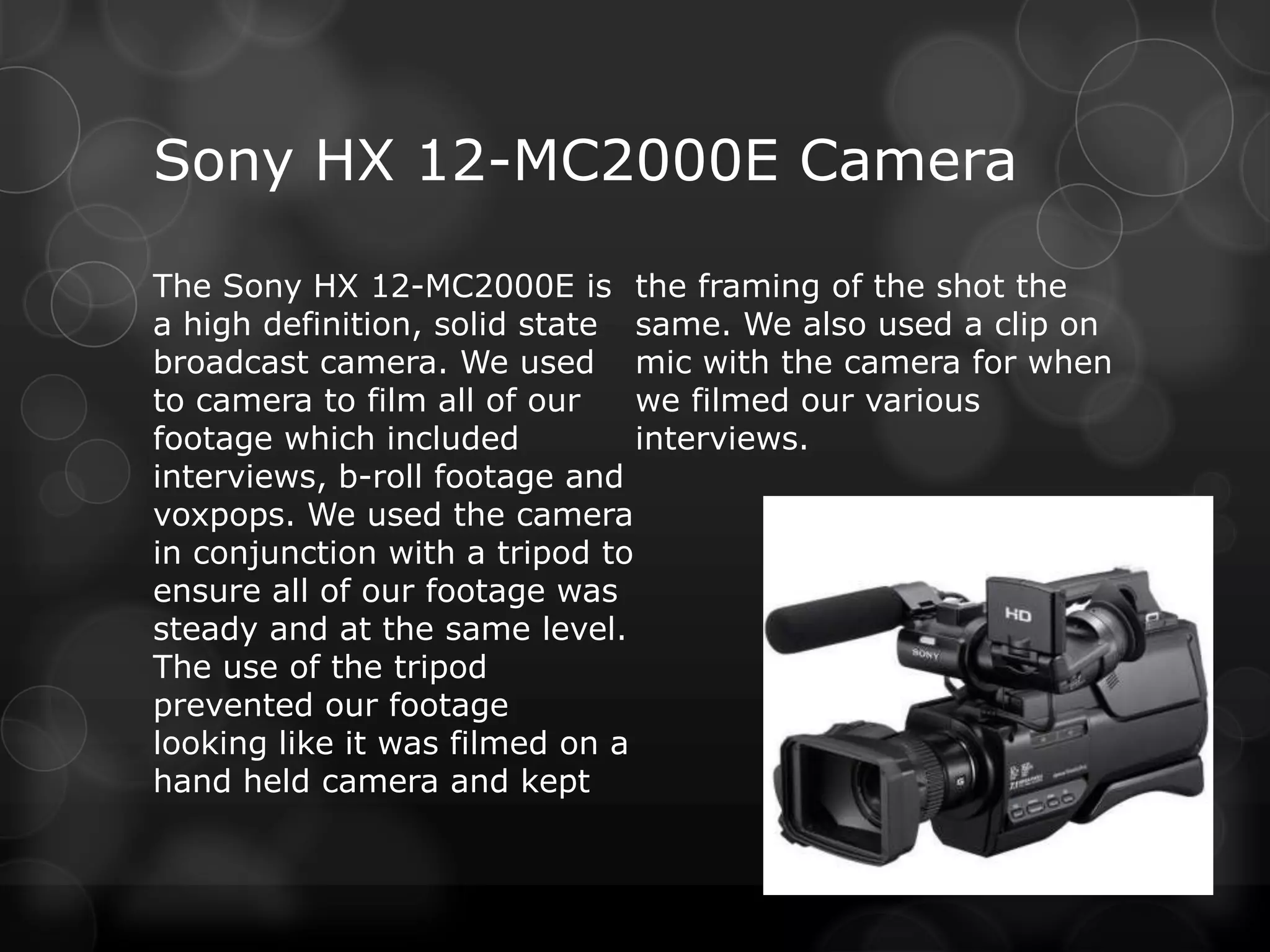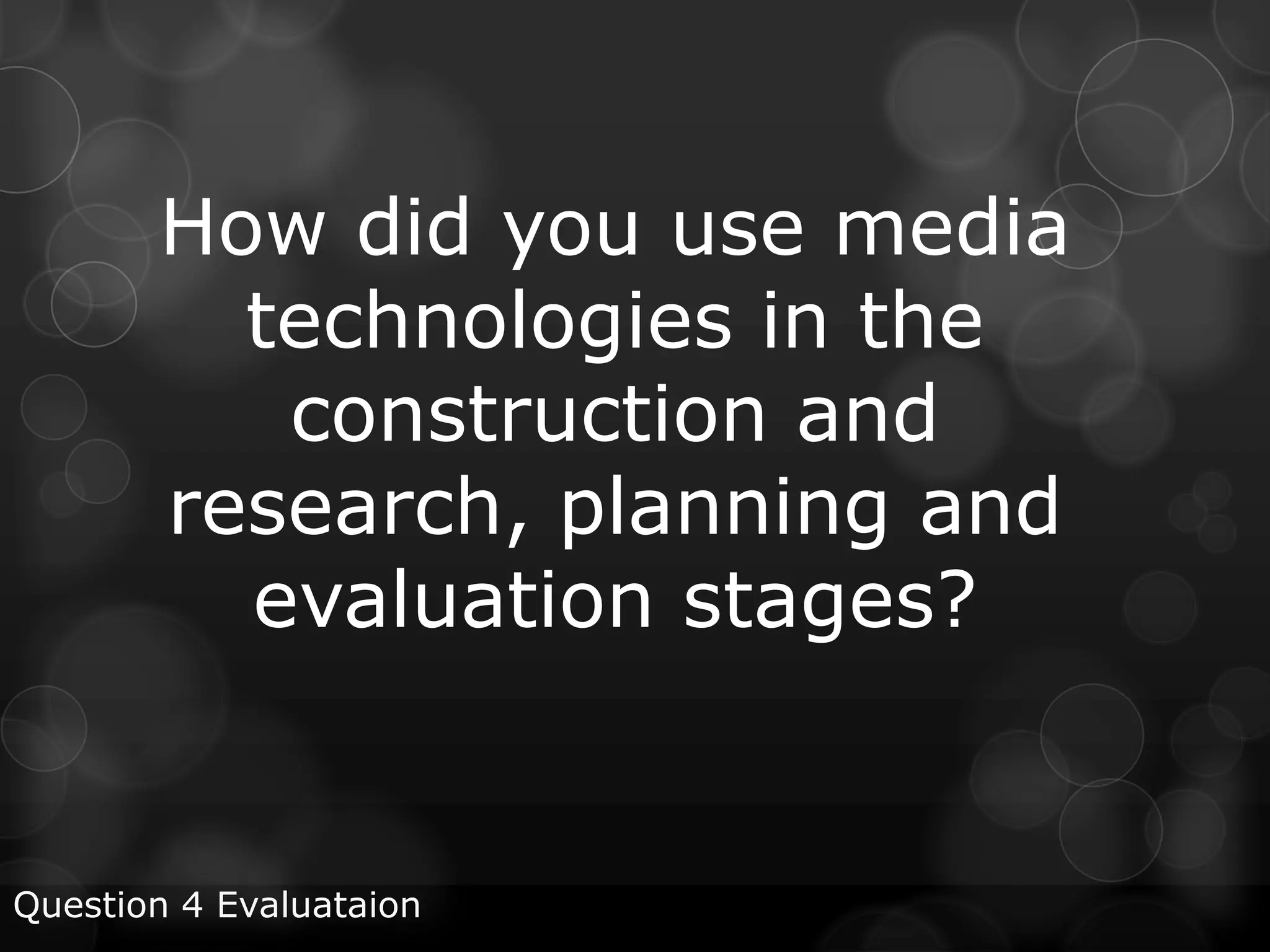 The document discusses various media technologies used during the construction, research, planning and evaluation stages of a project. Specifically, it mentions using a Sony camera, tripod, clip-on microphone, Dell desktop computer, Adobe Premiere and Photoshop software, online resources like Dafont, Brusheezy and YouTube, and a radio studio. These technologies were used for filming interviews and b-roll footage, storing and editing video, creating promotional materials, conducting research, and recording audio.