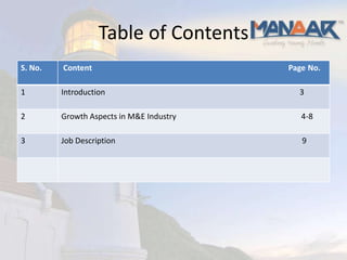 The media and entertainment industry in India is growing rapidly, with an expected CAGR of 13% through 2014. Key sectors like television, print, radio, music, and gaming are all expanding, with television expected to reach INR 521 billion by 2014. Internet advertising is the fastest growing segment despite its small current size. The industry is benefiting from increasing consumer spending as well as the expansion of distribution platforms like cable, DTH, and digital media. Job opportunities exist in sales, client management, and delivering innovative advertising campaigns across various media.