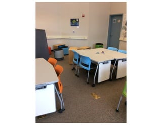 Chairs and tables on wheels. Purpose: move them around Work collaboratively, in partners, or by themselves. Individual whiteboards on the side for brainstorming.