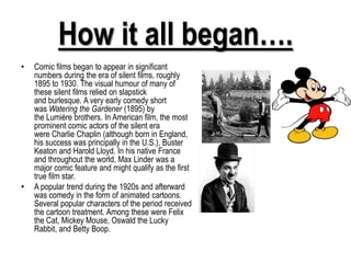 Comedy films aim to elicit laughter from the audience through humorous situations, exaggerated characters and dialogue. They take a lighthearted approach to drama in order to amuse and entertain viewers. The comedy genre has evolved over time, with silent films relying more on slapstick and visual humor. More recent subgenres like action-comedy, black comedy, and horror-comedy blend comedy with other genres through humorous takes on conventions like action scenes, taboo topics, and horror tropes.