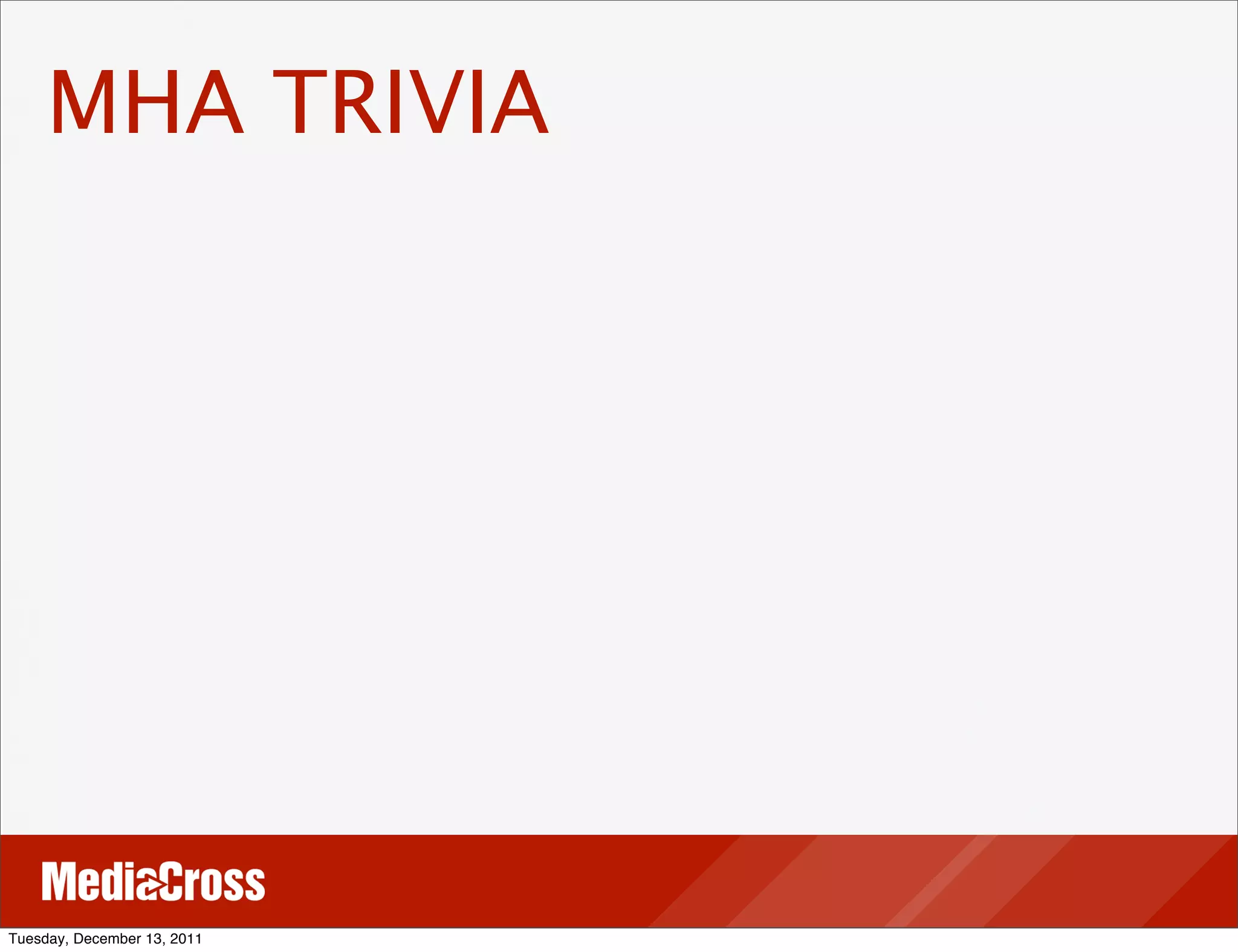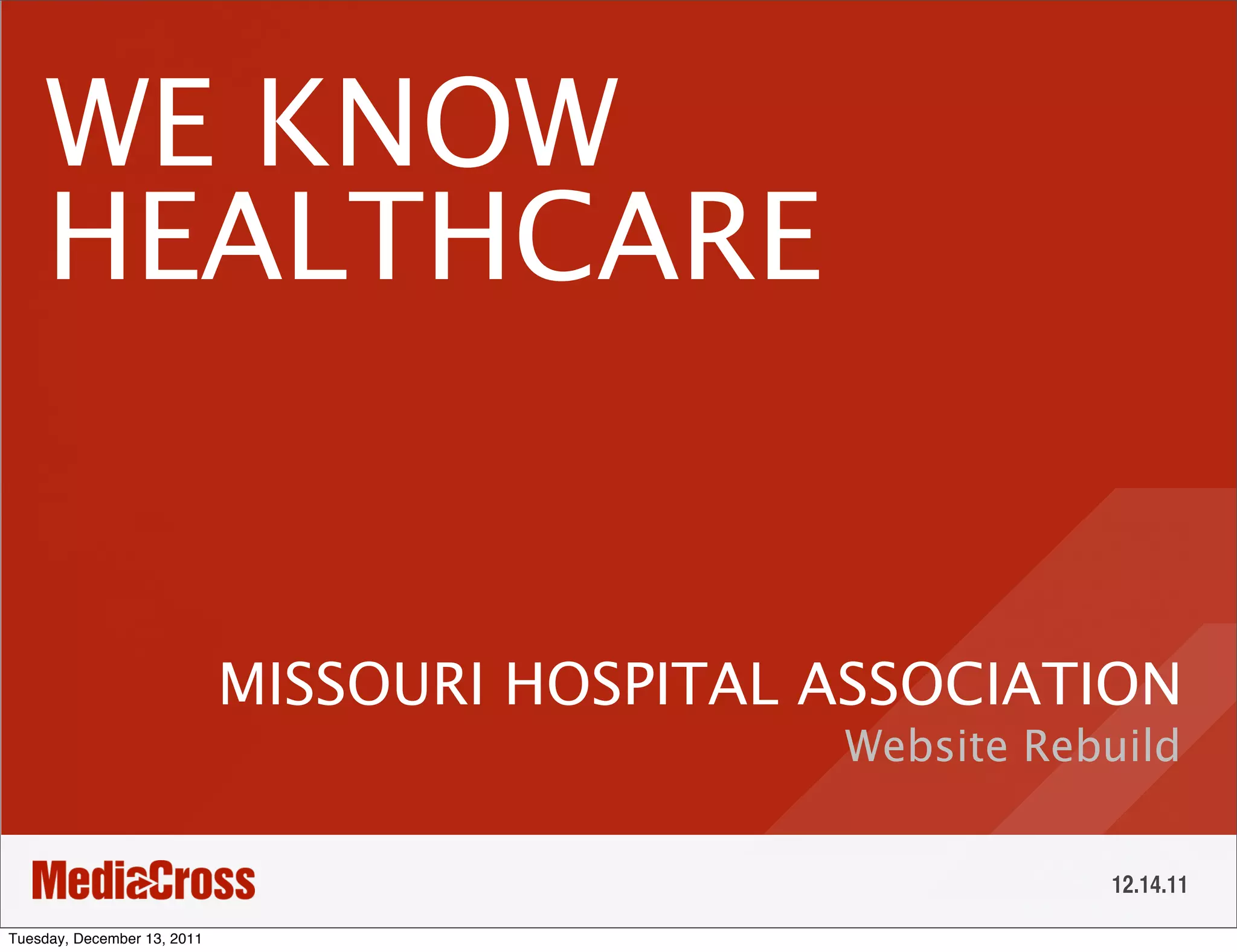 The document discusses MediaCross presenting their proposal and scope of work for redesigning the Missouri Hospital Association (MHA) website. It introduces the MediaCross team and their experience working on healthcare marketing projects. It then outlines MHA's objectives of increasing brand awareness, promoting educational materials, and being seen as a credible healthcare source. The proposed scope of work includes discovery, information architecture, design, development, and analytics. Additional ongoing tactics like email marketing, social media, and search support are also mentioned.