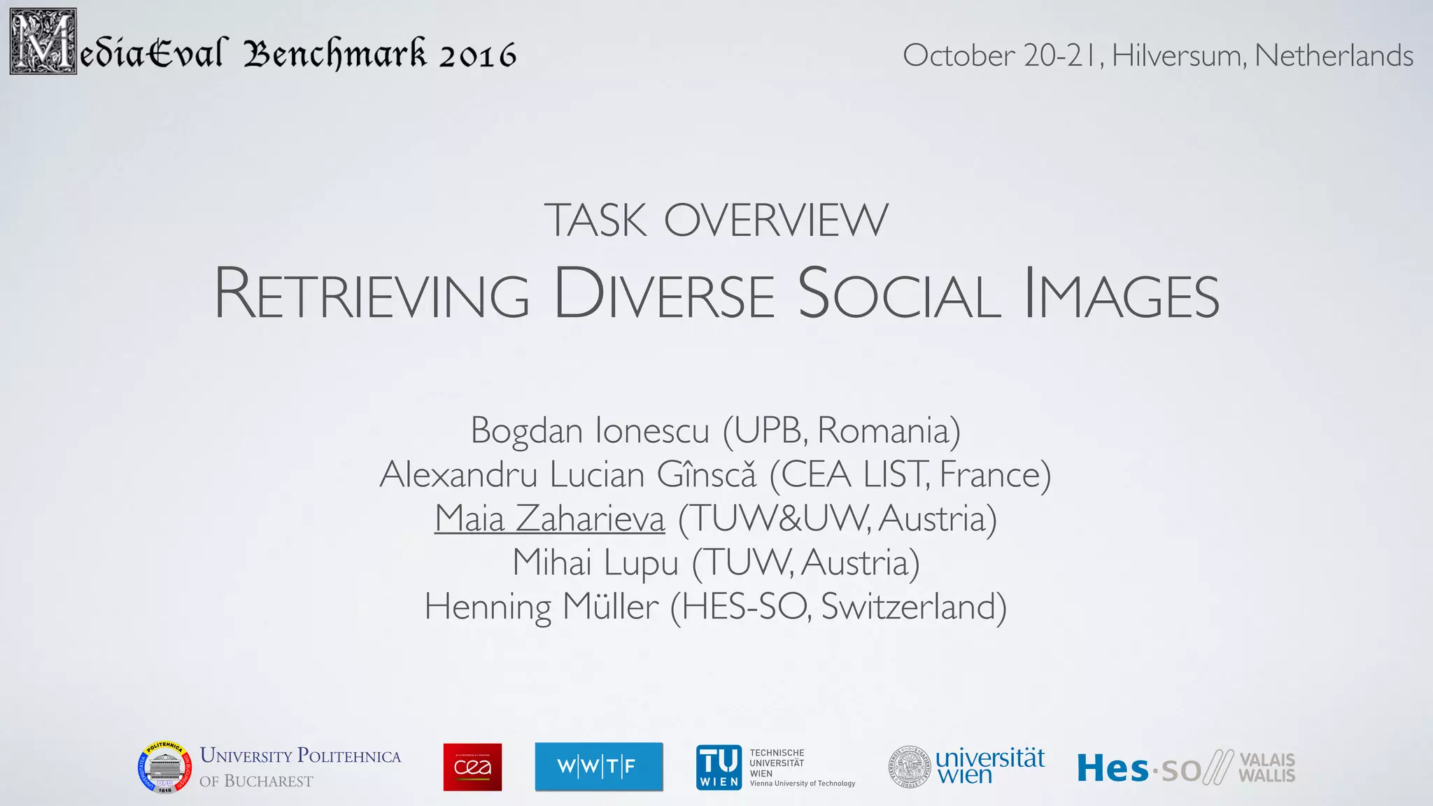 The document outlines a task aimed at improving the diversity of image search results using photos from Flickr, involving multiple participants and queries. The primary goal is to refine a ranked list of visually diverse and relevant images for general-purpose queries. Various metrics are employed for evaluation, including precision and recall, with specific submission requirements for participating teams.