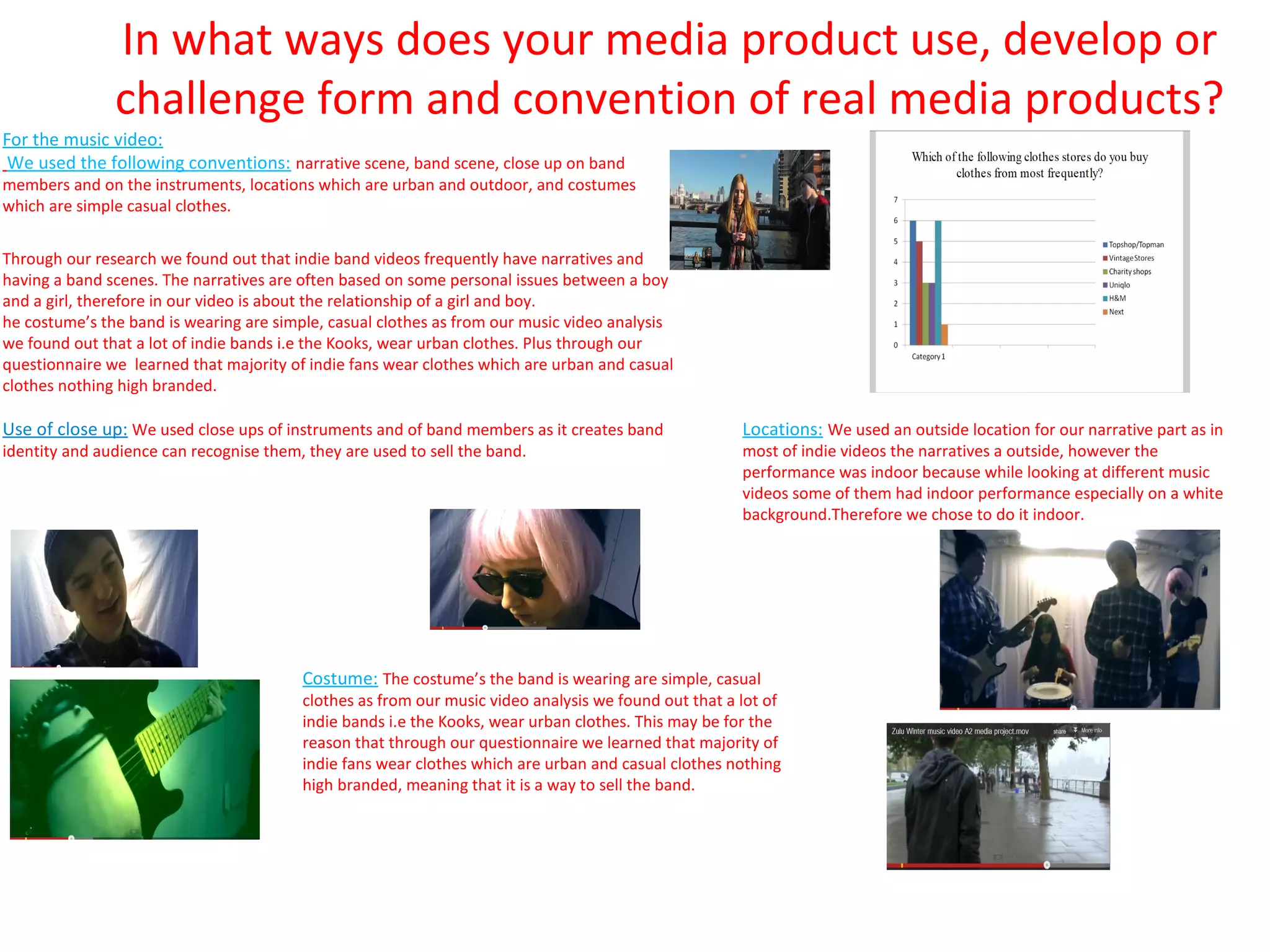 The document discusses the conventions used in creating a music video and related media for an indie band. For the music video, common conventions like narrative scenes, band performance scenes, and close-ups of band members and instruments were used. Locations were outdoor for the narrative and indoor for the performance. Costumes were casual, urban clothes to match typical indie styles. For the digipak, conventions like photos of band members and nature, contrasting colors, and font choices were followed. The poster design focused on tight framing, clear layout, prominent display of the band name in readable but not plain font, and an indie-style color scheme to attract attention.