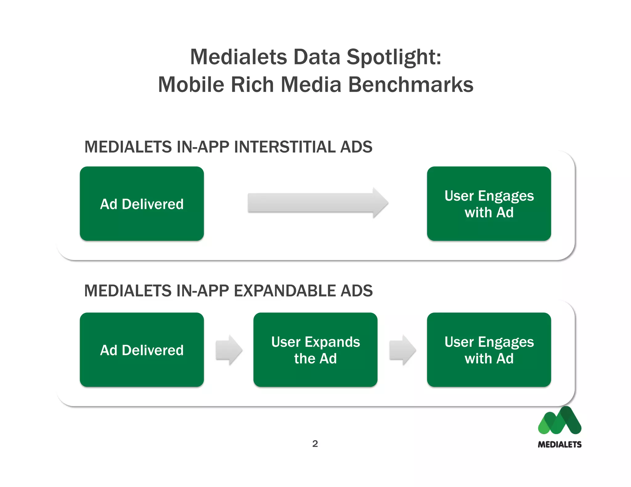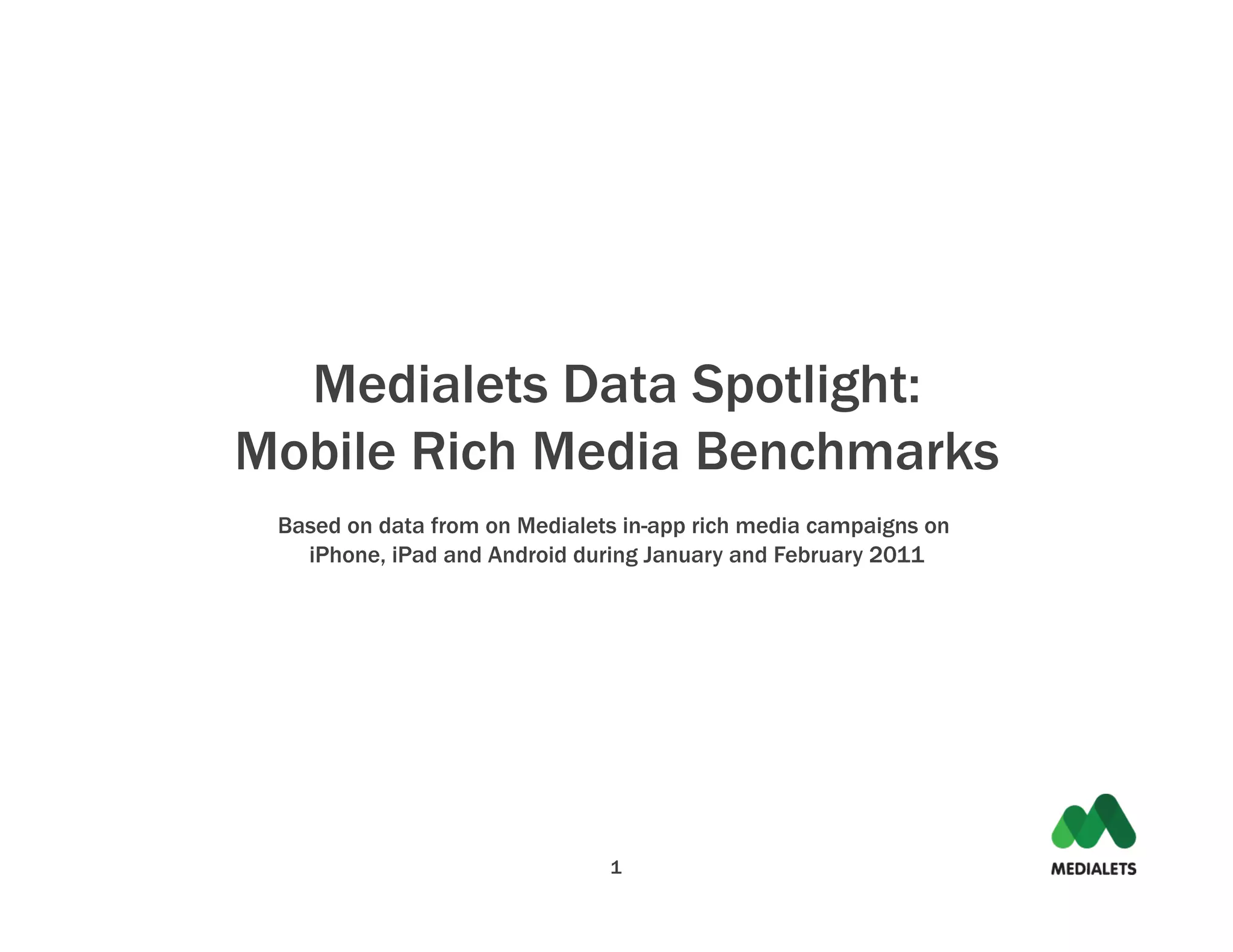 The Medialets Data Spotlight provides benchmarks for mobile rich media advertising based on in-app campaigns on iPhone, iPad, and Android during January and February 2011. Key metrics include an average engagement rate of 10% for interstitial ads and 1% for expandable ads, with specific engagement rates varying by vertical. The report highlights the performance of rich media ads and provides insights for future mobile ad strategies.