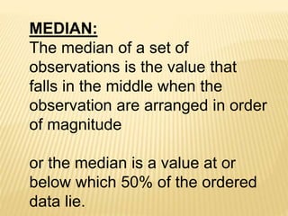 The median of a dataset is the middle value when the observations are arranged in ascending order. It is the value below which 50% of the observations lie. For an odd number of observations, the median is the middle value. For an even number, the median is the average of the two middle values. The median can be calculated for both grouped and ungrouped data using different formulas depending on whether the data is grouped by value or range. Examples are provided to demonstrate calculating the median for different types of datasets.