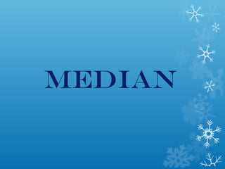 The median is the middle value in a data set arranged in numerical order. It represents the center of the data and is less affected by outliers than the mean. To calculate the median, the data is lined up from highest to lowest and the middle value is identified. For an even number of values, the median is the average of the two middle values. The document provides an example of how outliers can significantly impact the mean but not the median of a classroom test score data set.