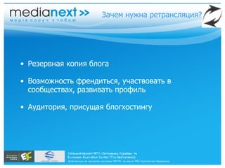 medianext_d2_2_retranslation AM 1. Ретрансляція сервісів. Що варто, і що не варто робити ІІ модуль Курс з комунікації в нових медіа Андрій Маштаков 2. Резервная копия блога Возможность френдиться, участвовать в сообществах, развивать профиль Аудитория, присущая блогхостингу Зачем нужна ретрансляция? 3. FeedBurner — веб-сервис, который пропускает через себя RSS-потоки, исправляет в них мелкие ошибки и может добавить потоку дополнительную функциональность, например, кнопку Play для подкастов. Кроме того, предоставляет статистику подписки на RSS-поток. (Wikipedia) Что такое FeedBurner? 4. 5. 6. 7. 8. 9. 10. Не путайте общение и информирование Разделяйте потоки информации тематически Создайте место в интернете, куда будет стекаться вся ваша информация Советы по использованию 11. Наші контакти: вул.Ризька 15, Київ, 04112 Тел.факс (8044) 458 44 40 сайт: http://internews.ua/ блог: http://medianext-ua.livejournal.com/ Дякуємо за увагу!