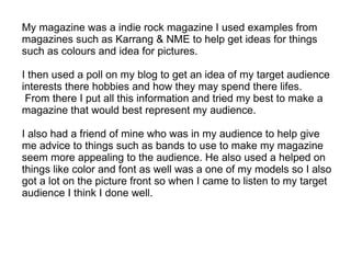 - The document is a reflection by Craig Maskell on creating an indie rock magazine. He drew inspiration from magazines like Kerrang and NME for design elements.