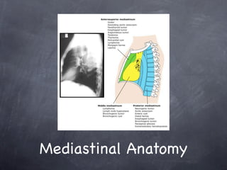 Mediastinal masses can occur in the anterior, middle, or posterior mediastinum. Common anterior mediastinal masses include thymoma, Hodgkin's lymphoma, and thyroid tumors. Middle mediastinal masses may include bronchogenic cysts or enlarged thyroid tumors. Posterior mediastinal masses are often neurogenic tumors, esophageal tumors, or hiatal hernias. Imaging with CT scan and biopsy are used to identify mass characteristics and guide management, which could include surgical excision or biopsy depending on the suspected malignancy risk. Complications of mediastinal mass surgery include increased risks of morbidity due to potential airway obstruction.