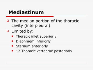 The mediastinum is the central portion of the thoracic cavity located between the lungs. It is divided into the superior mediastinum above the sternal angle and inferior mediastinum below. The inferior mediastinum is further divided into the anterior, middle, and posterior mediastinum, with the middle mediastinum containing the heart and pericardium.