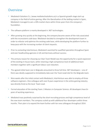 Mediatech Solutions S.L. established a nearshore development team in Belgrade, Serbia using InterVenture's Own Team Model. The initial team consisted of 3 .NET developers, which Mediatech later expanded to 7 developers within 3 months due to their success. InterVenture conducted a thorough recruiting process over 9 weeks to source qualified candidates, including multiple interview rounds. Mediatech was pleased with the high competence level and quick expansion enabled by the nearshore development team model.