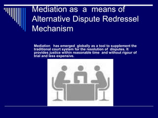 Mediation is an alternative dispute resolution method where an impartial third party (mediator) facilitates discussion between disputing parties to help them reach an agreement. It provides quicker and more affordable justice compared to traditional court litigation. The document discusses what mediation is, its benefits over litigation, key components like impartiality and confidentiality, and types of disputes where it can be effectively used. The conclusion states that mediation provides an amicable solution agreed upon by both parties in a timely manner, reducing courts' workload.