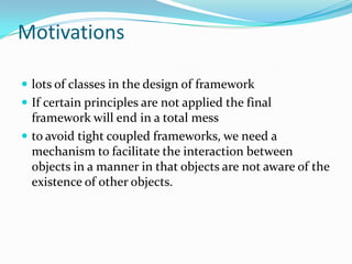 The mediator pattern promotes loose coupling by defining an object that encapsulates how a set of objects interact. It defines an intermediary object that manages interactions between peers. This allows objects to interact without having explicit knowledge of each other. The mediator pattern identifies objects that would benefit from decoupling, encapsulates their interactions in a mediator class, and has peer objects interact through the mediator instead of directly with each other.