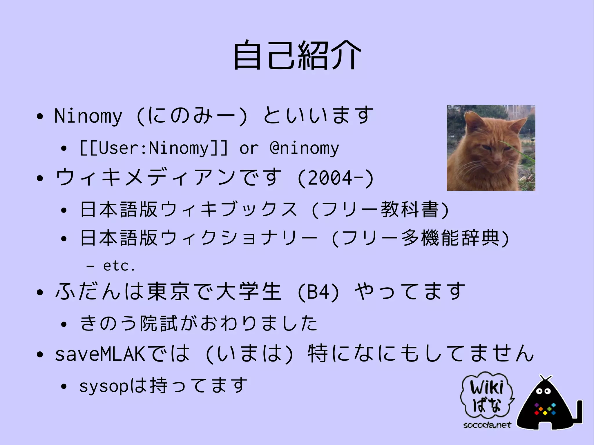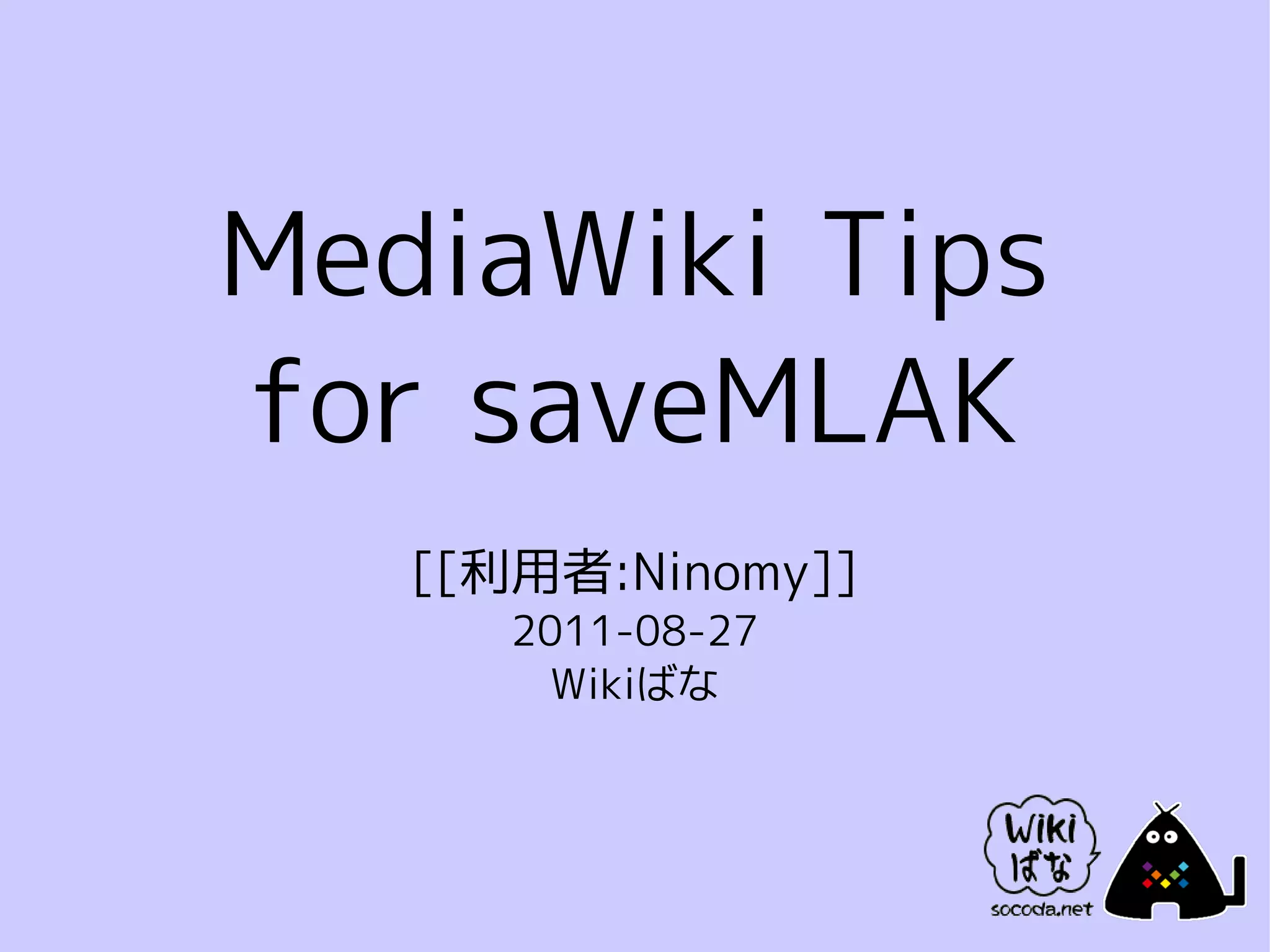 MediaWiki tips used in saveMLAK (http://savemlak.jp/) website. Presentation in wikibana http://wikibana.socoda.net/